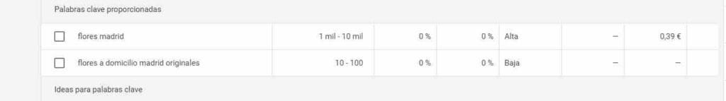 Por el contrario si somos más específicos y ponemos “ flores a domicilio Madrid originales “ tenemos mucha menos búsquedas pero también una competencia baja